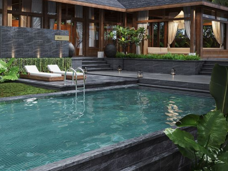 Biệt thự 4 tầng mái Nhật có hồ bơi là sự kết hợp hoàn hảo giữa phong cách kiến trúc truyền thống Nhật Bản và các yếu tố hiện đại, tạo nên một không gian sống sang trọng và tinh tế. Đặc điểm nổi bật nhất của biệt thự này chính là mái dốc nhẹ nhàng, được thiết kế theo kiểu mái Nhật, mang đến cảm giác thanh thoát và bình yên, đồng thời cũng giúp thoát nước nhanh chóng trong điều kiện thời tiết mưa nhiều. Hồ bơi thường được bố trí ở khu vực sân vườn hoặc tầng trệt, nơi mà thiên nhiên và kiến trúc hòa quyện vào nhau, tạo ra một không gian thư giãn lý tưởng. Ngoài là nơi để thư giãn và rèn luyện sức khỏe, chúng còn đóng vai trò như một điểm nhấn thẩm mỹ, tạo sự liên kết giữa không gian nội thất và ngoại thất, mở ra một góc nhìn thoáng đãng và mát mẻ.